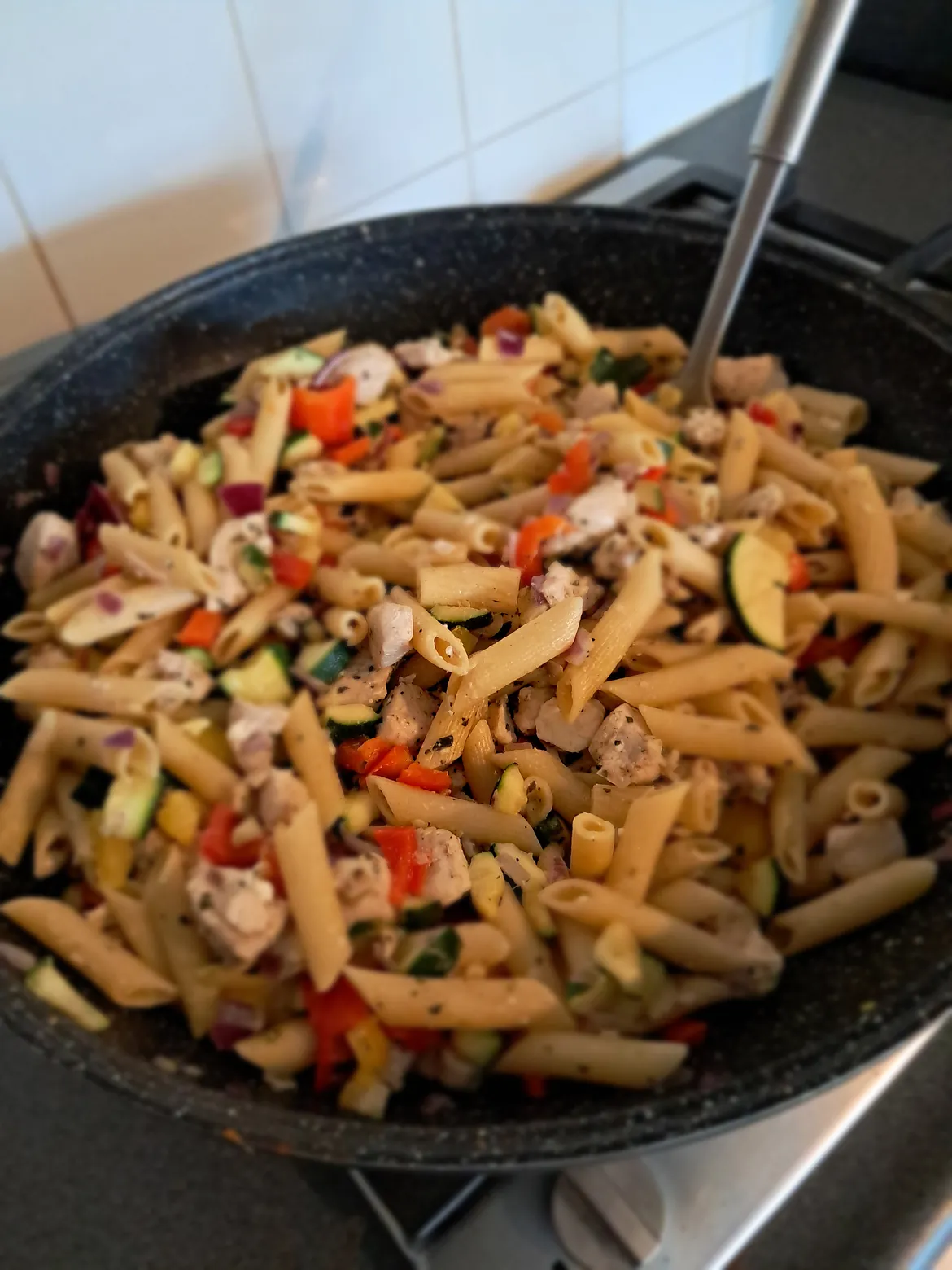 5) Alles samenvoegen: Doe de kip terug in de pan samen met de pasta. Breng op smaak met oregano, basilicum, peper en eventueel wat zout (let op: feta is al zout). Verkruimel daarna de helft van de feta erdoor en roer goed door. Of voeg de feta pas als laatste stap bij het serveren toe, voor een frissere bite.